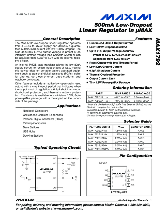 MAX1792 500mA, Low-Dropout Linear Regulator in µMAX