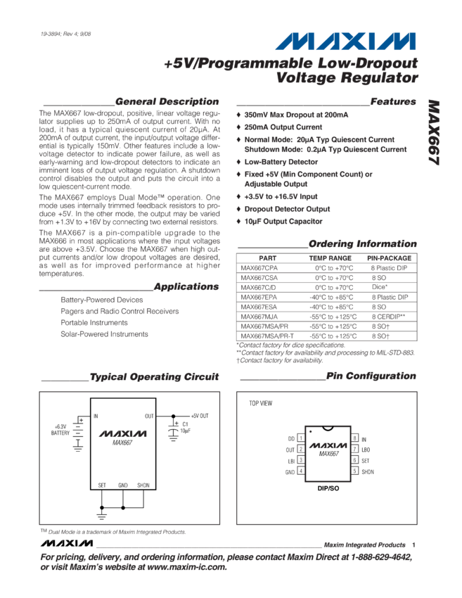MAX667 +5V Programmable, Low-Dropout Voltage Regulator