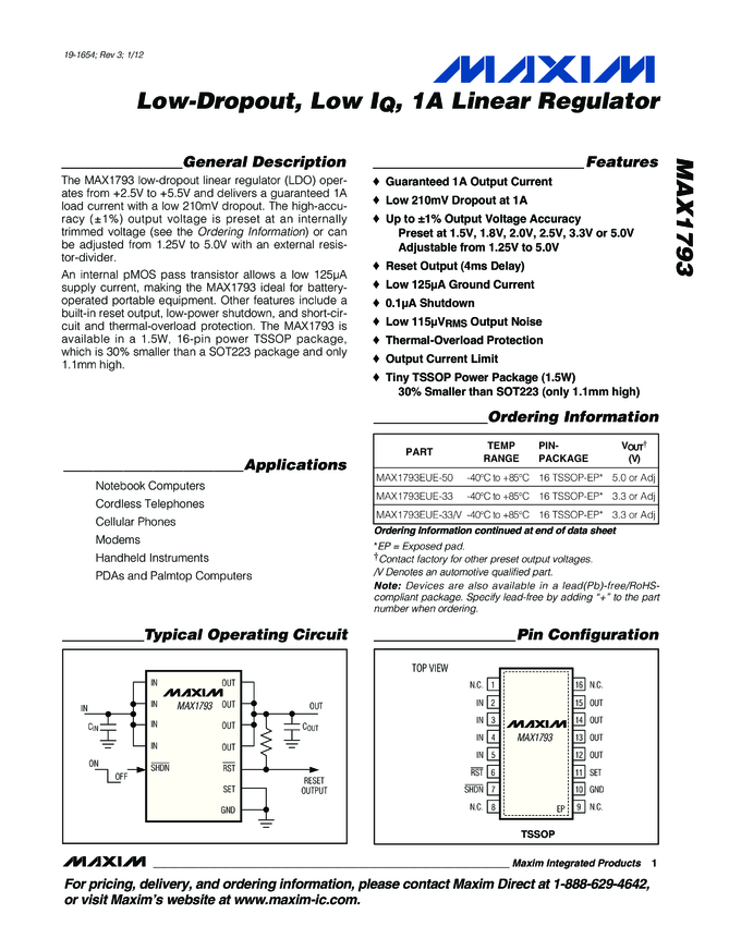 MAX1793 Low-Dropout, Low-IQ, 1A Linear Regulator