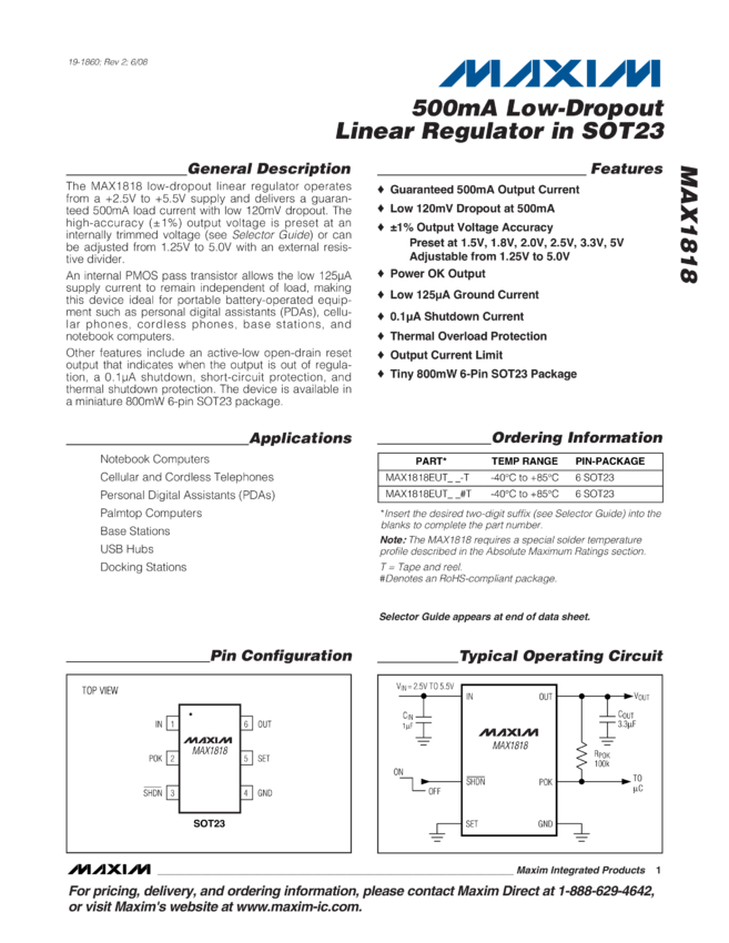 MAX1818 500mA, Low-Dropout Linear Regulator in SOT23