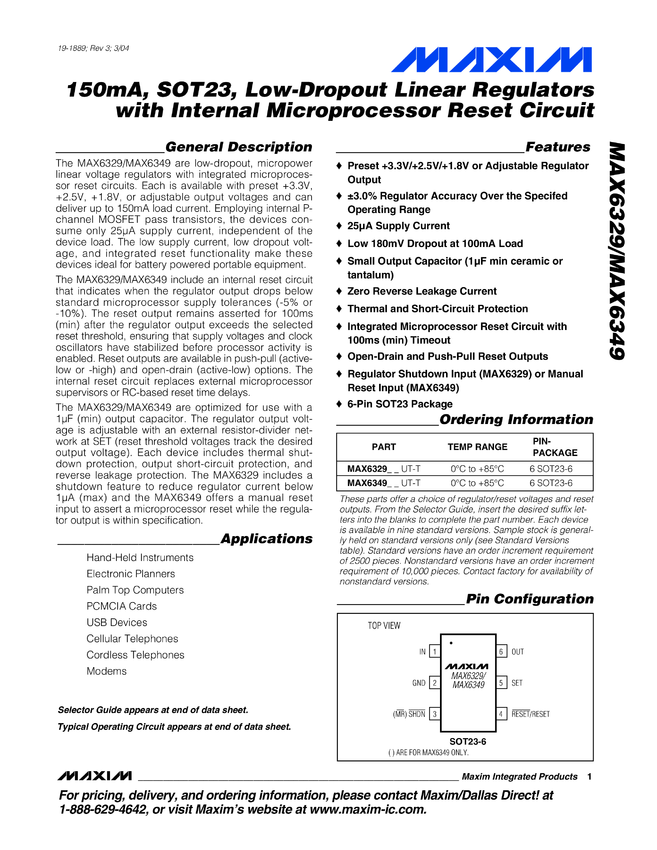 MAX6329, MAX6349 150mA, SOT23, Low-Dropout Linear Regulators with Internal Microprocessor Reset Circuit