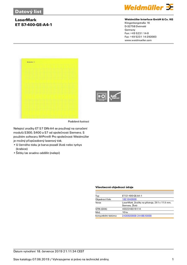 Weidmüller 1821040000 ET S7-400-GE-A4-1 Drukarka systemu etykietującego Pole powierzchni etykietowania: 11.50 x 251 mm ż