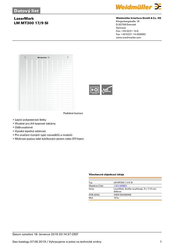 Weidmüller 1724151687-10 LM MT300 17X9 GE Drukarka systemu etykietującego Sposób montażu: przyklejanie Pole powierzchni