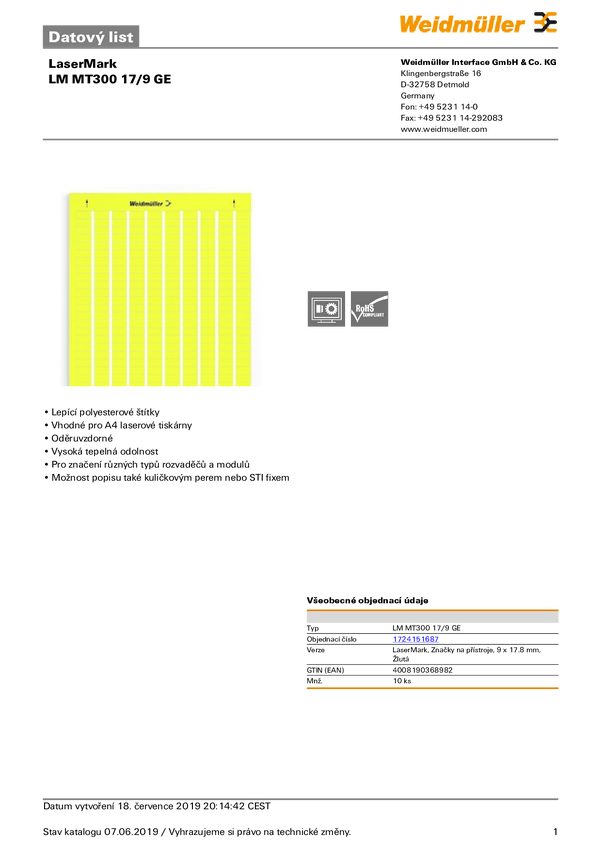 Weidmüller 1749321687 LM MT300 18X6,5 GE Drukarka systemu etykietującego Sposób montażu: przyklejanie Pole powierzchni e