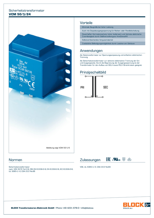 Transformator do płytki drukowanej Block VCM 50/1/24