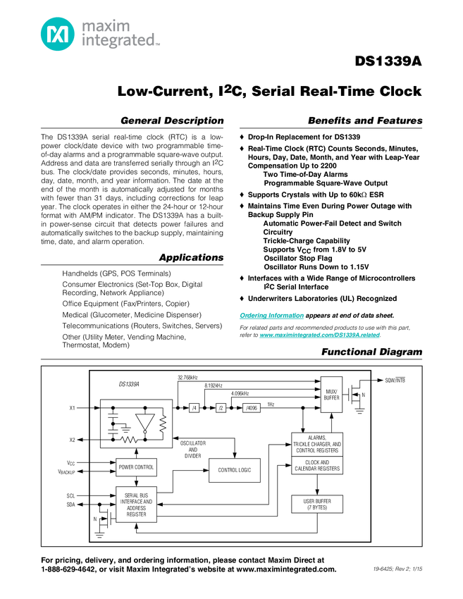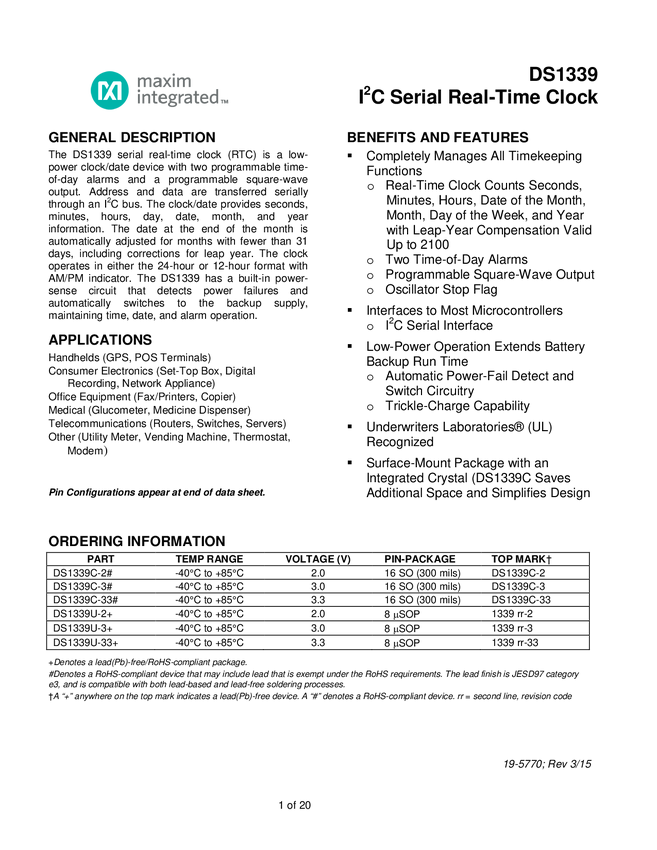 DS1339, DS1339C, DS1339U I²C Serial Real-Time Clock
