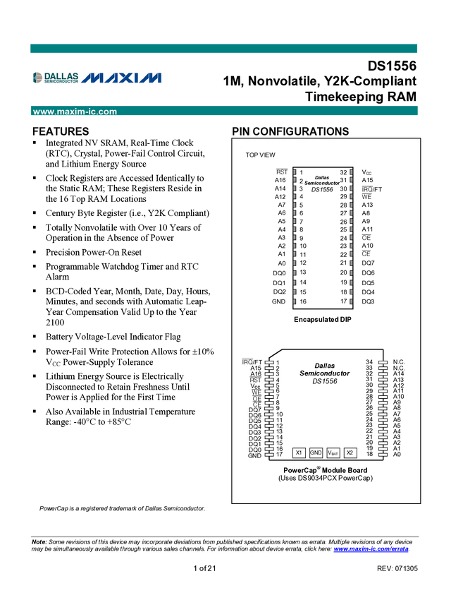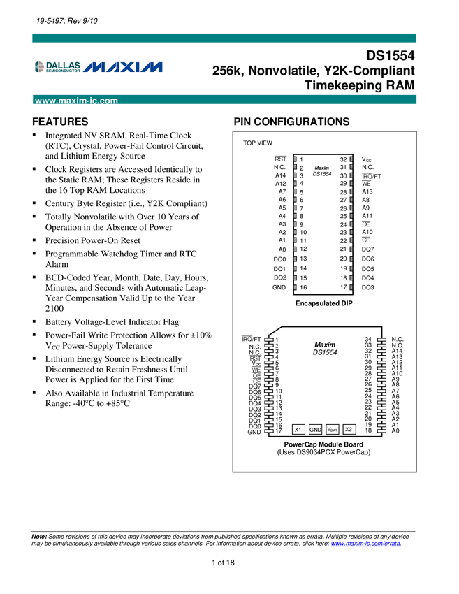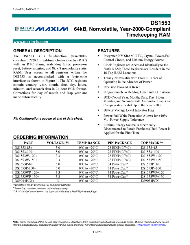 64kB, Nonvolatile, Year-2000-Compliant Timekeeping RAM