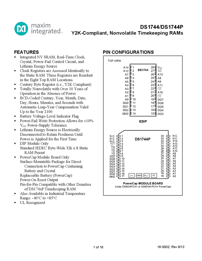 DS1744, DS1744P Y2K-Compliant, Nonvolatile Timekeeping RAMs