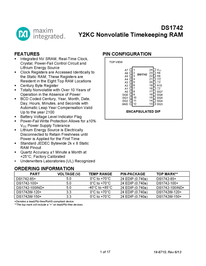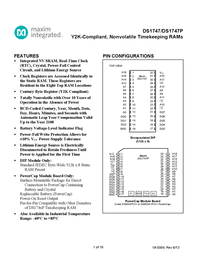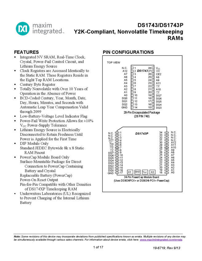 DS1743, DS1743P Y2K-Compliant, Nonvolatile Timekeeping RAMs
