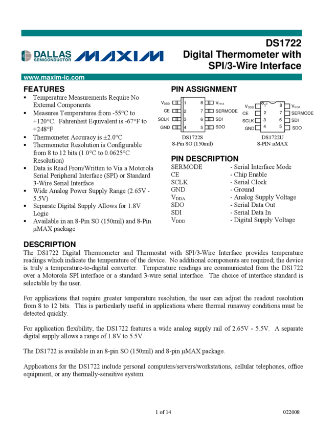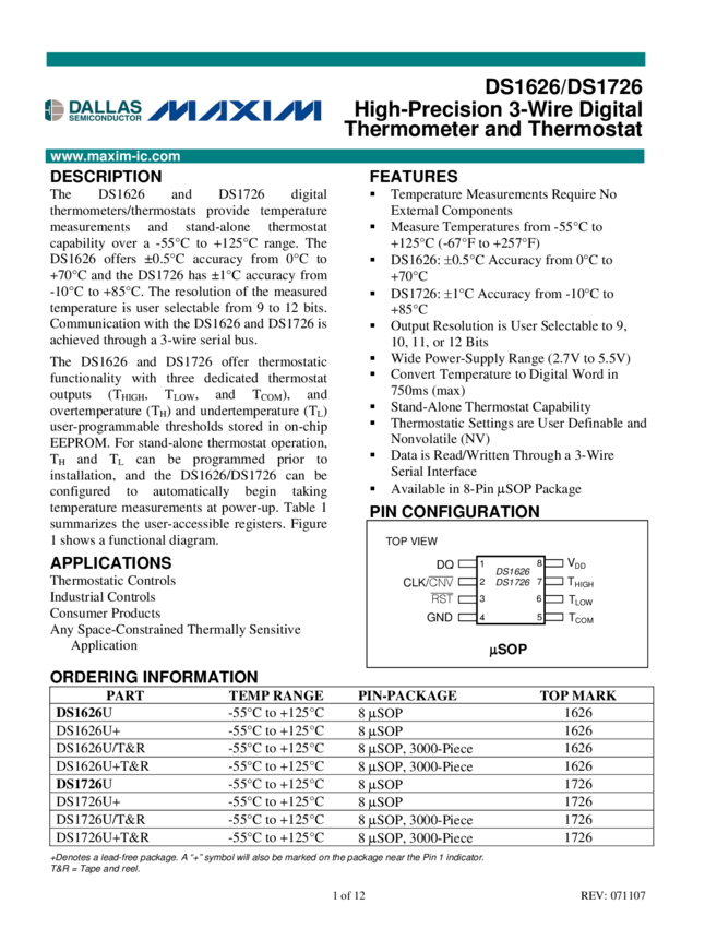 DS1726 3-Wire &#1771&#176C Accurate Digital Thermometer and Thermostat
