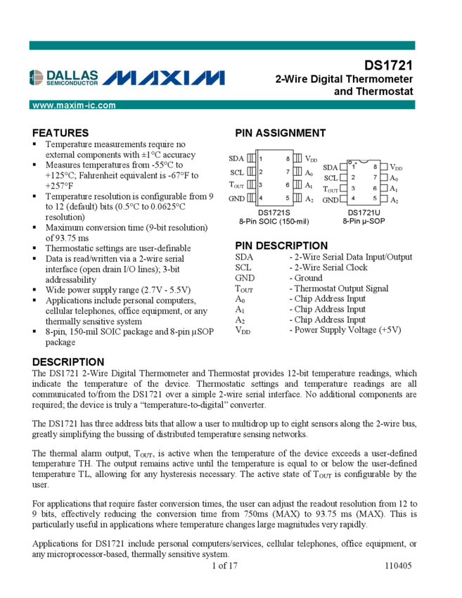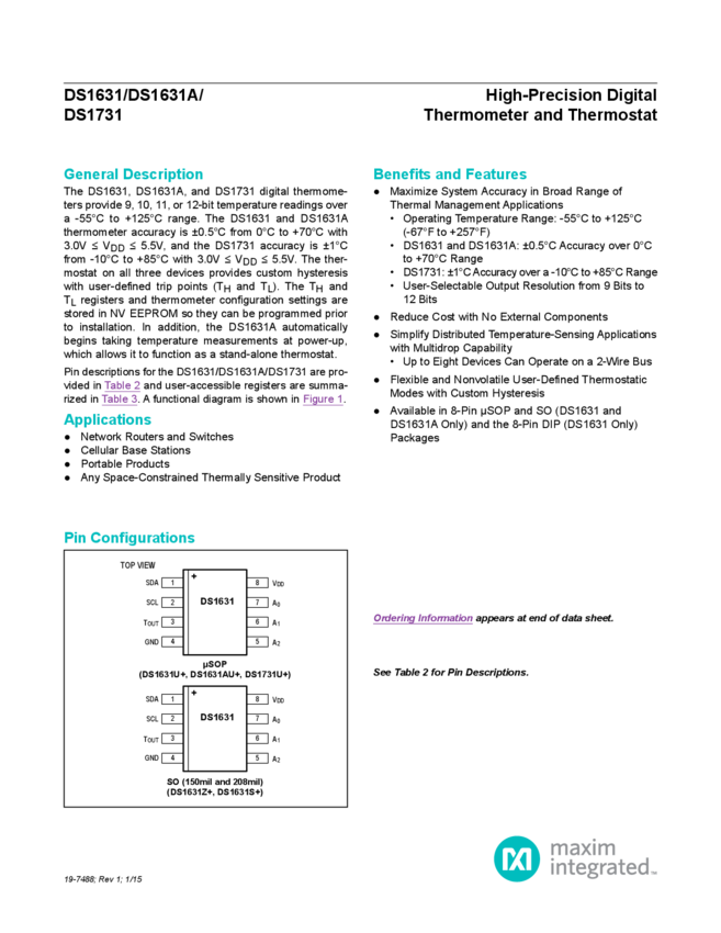 DS1631, DS1631A, DS1731 High-Precision Digital Thermometer and Thermostat