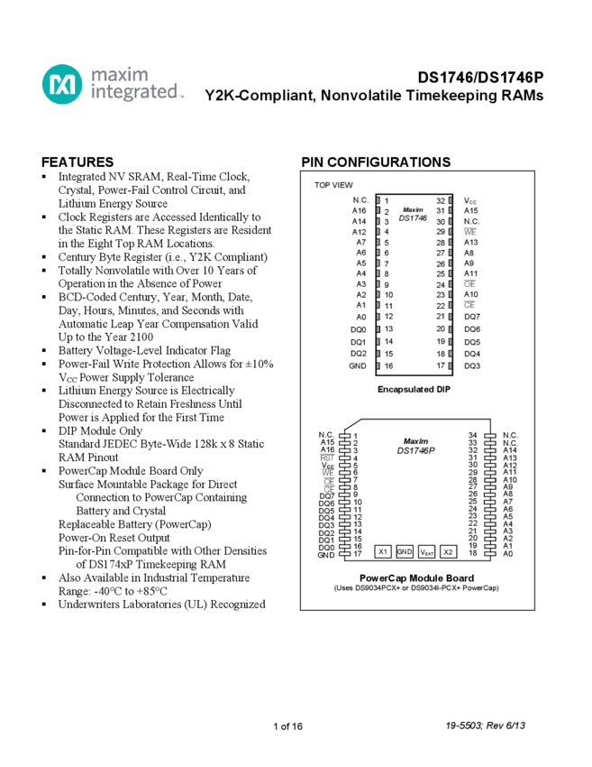 DS1746, DS1746P Y2K-Compliant, Nonvolatile Timekeeping RAMs