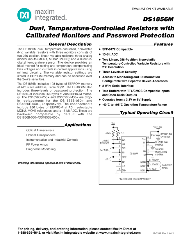 DS1856M Dual, Temperature-Controlled Resistors with Calibrated Monitors and Password Protection