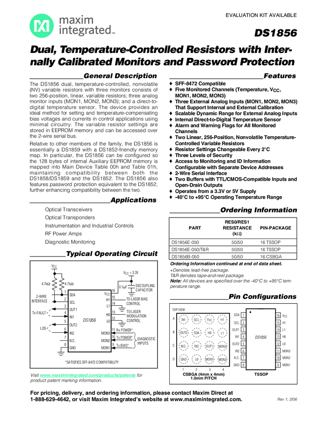 DS1856 Dual, Temperature-Controlled Resistors with Internally Calibrated Monitors and Password Protection