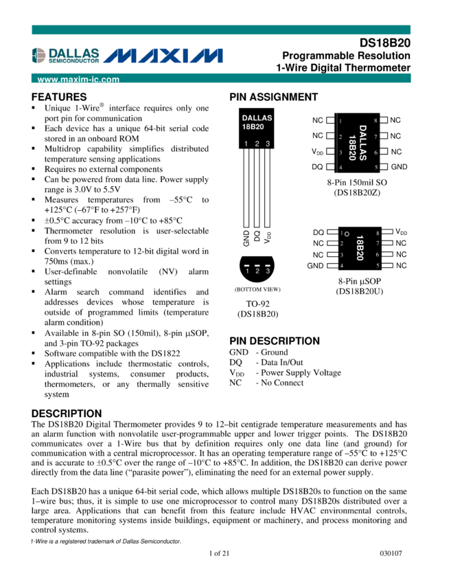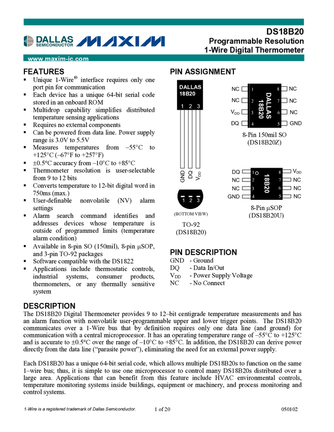 DS18B20 High-Precision 1-Wire Digital Thermometer