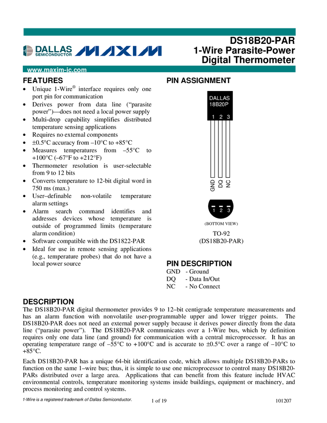 Cyfrowy czujnik z interfejsem 1-Wire, rozdzielczość 9-12 bit, TO-92, -55/+125C