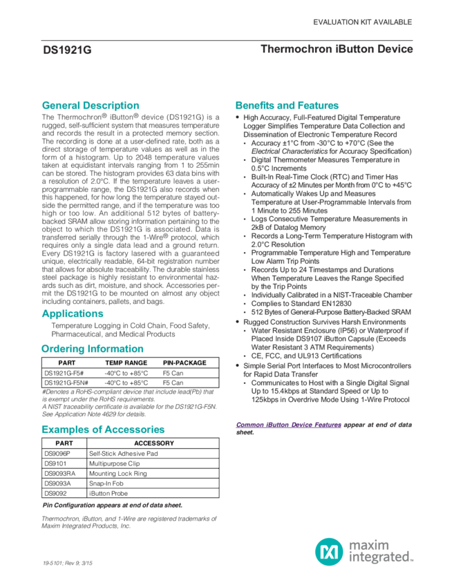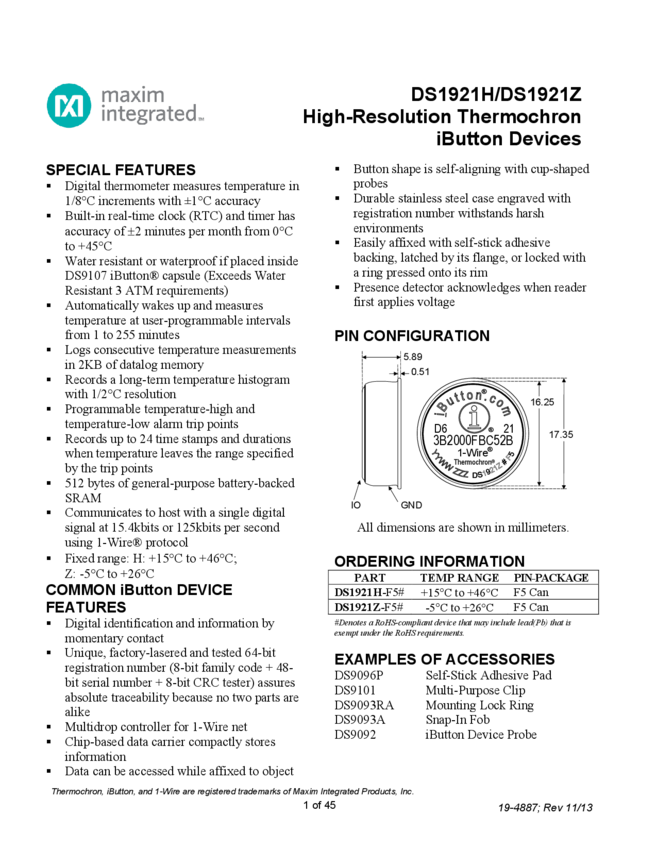 DS1921H, DS1921Z High Resolution Thermochron iButton Range H: +15°C to +46°C; Z: -5°C to +26°C