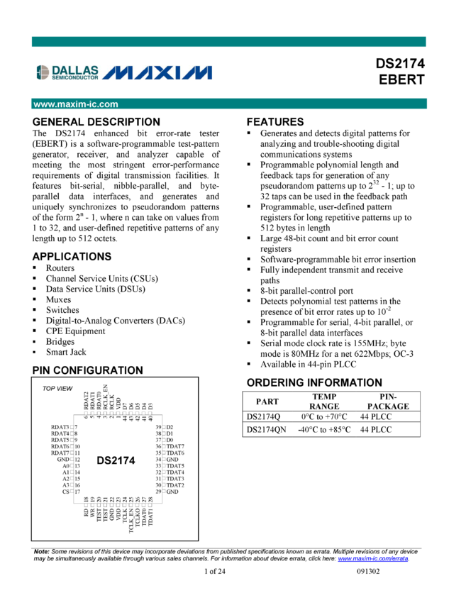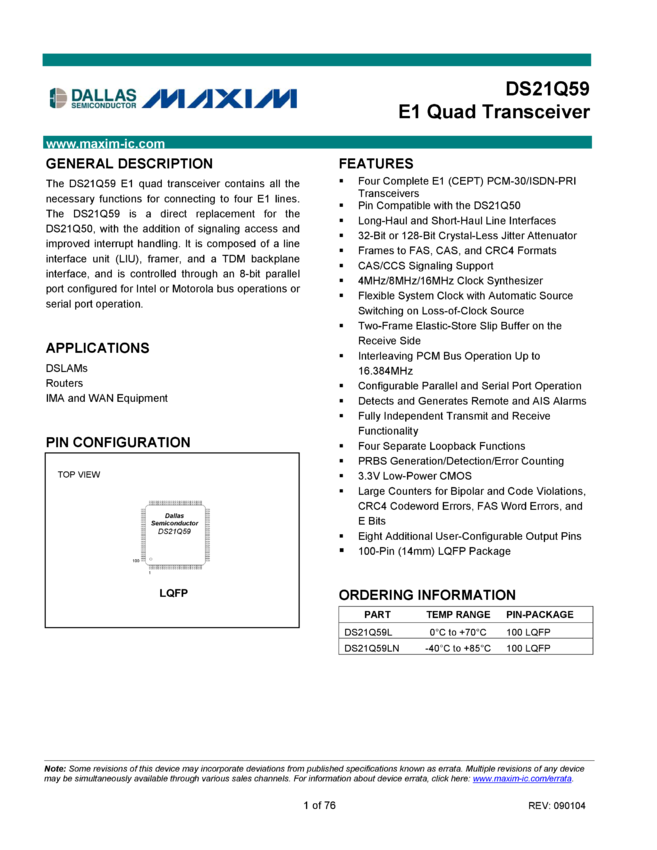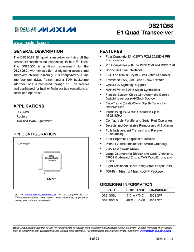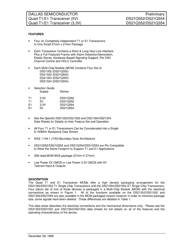 DS21Q352, DS21Q354, DS21Q552, DS21Q554 Quad T1/E1 Transceiver (3.3V, 5.0V)
