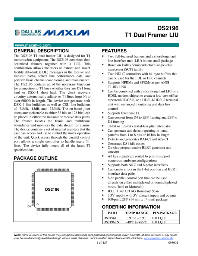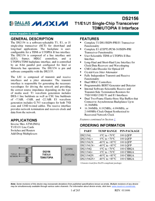 DS2156, DS2156L, DS2156LN T1/E1/J1 Single-Chip Transceiver TDM/UTOPIA II Interface