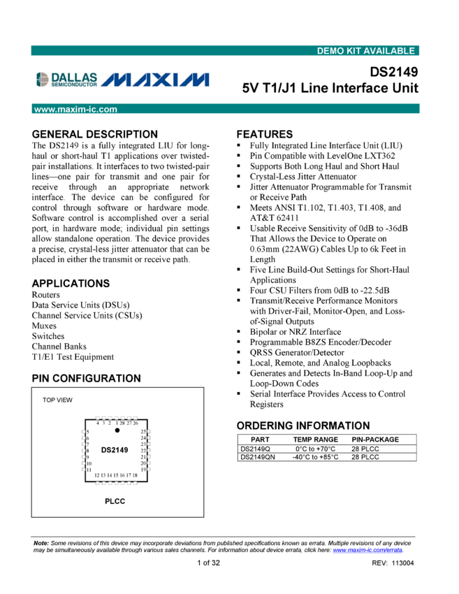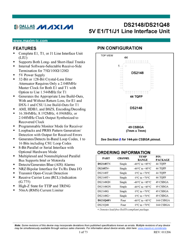 DS2148, DS21Q48 5V E1/T1/J1 Line Interface
