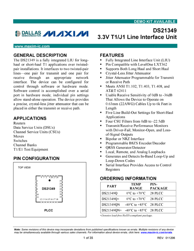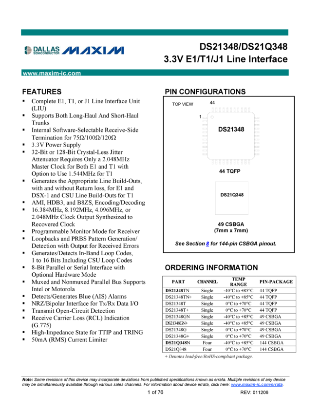 DS21348, DS21Q348 3.3V E1/T1/J1 Line Interface