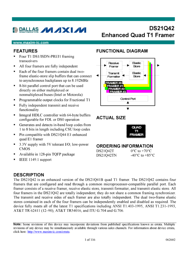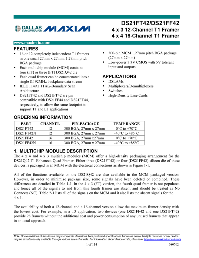 DS21FF42, DS21FT42 4 x 4 16 Channel T1 Framer / 4 x 3 12 Channel T1 Framer