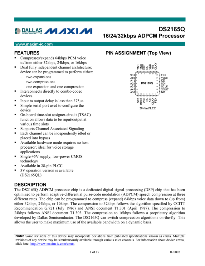 DS2165, DS2165Q 16/24/32kbps ADPCM Processor