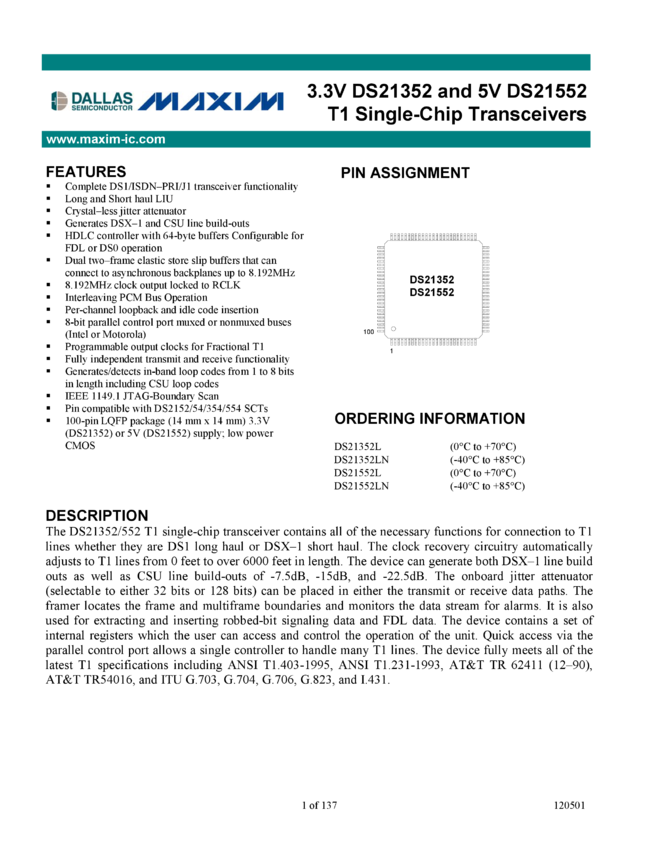 DS21352, DS21552 3.3V DS21352 and 5V DS21552 T1 Single Chip Transceivers
