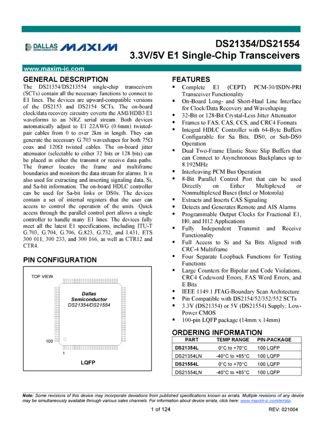 DS21354, DS21554 3.3V/5V E1 Single Chip Transceivers (SCT)