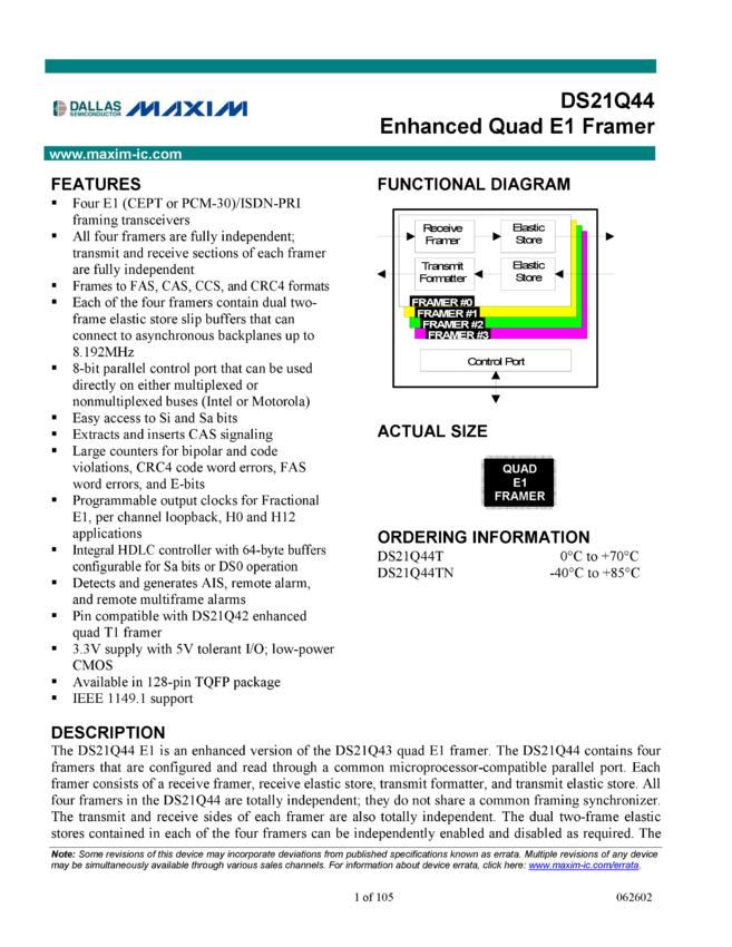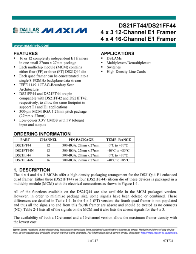 DS21FF44, DS21FT44 4x3 Twelve Channel E1 Framer / 4x4 Sixteen Channel E1 Framer
