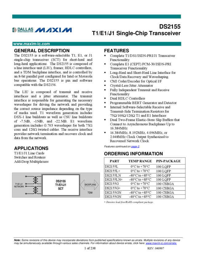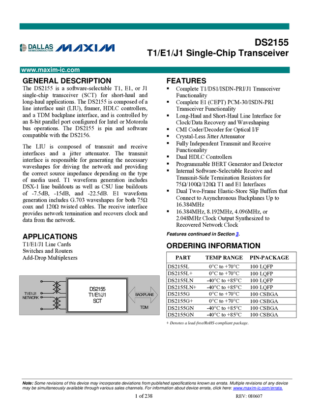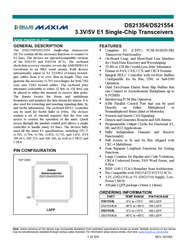 3.3V DS21352 and 5V DS21552 T1 Single Chip Transceivers