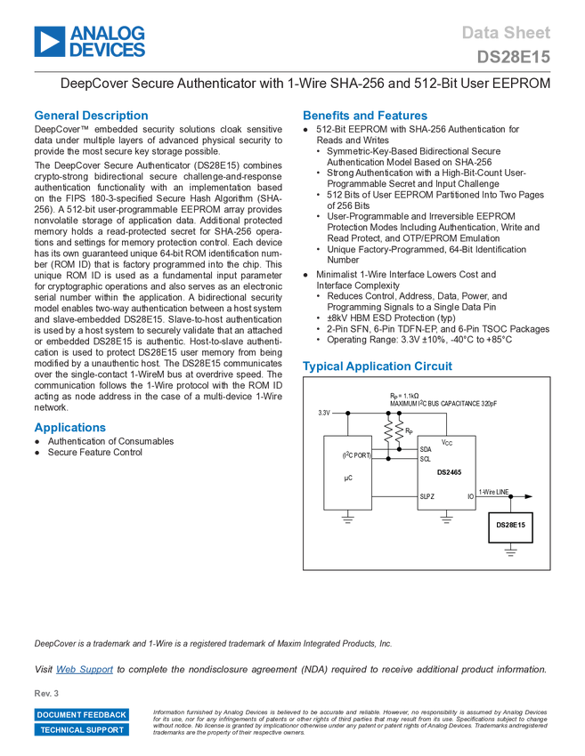 DS28E15 DeepCover Secure Authenticator with 1-Wire SHA-256 and 512-Bit User EEPROM