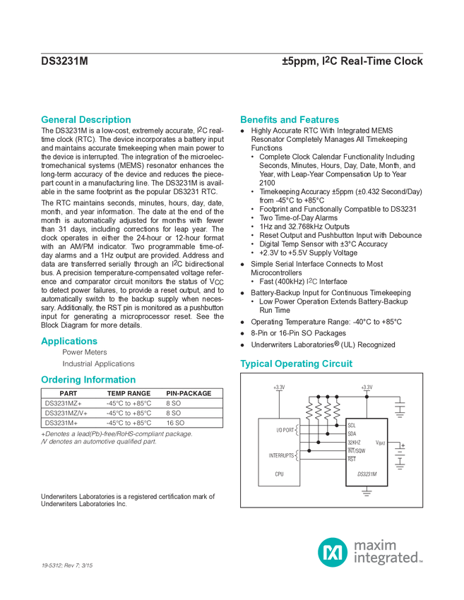 DS3231M ±5ppm, I²C Real-Time Clock
