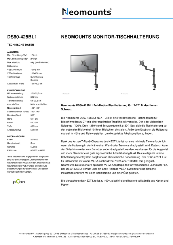 Neomounts Uchwyt do monitora, stołowy DS60-425BL1 1 Wyświetlacz 43,2 cm (17") - 68,6 cm (27") czarny Uchylny, Obrotowy,