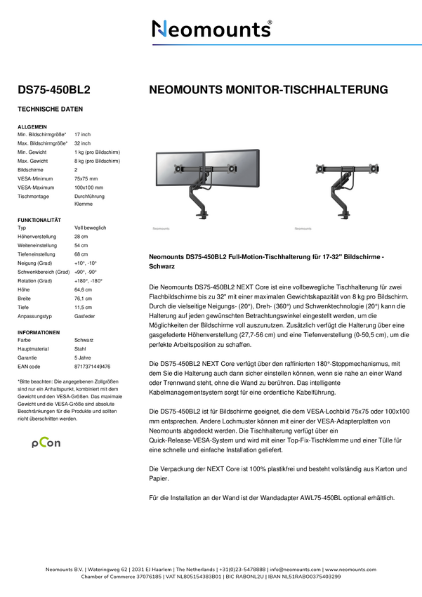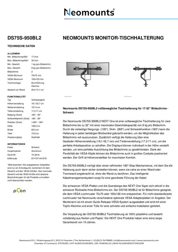 Neomounts Uchwyt do monitora, stołowy DS75S-950BL2 2 Wyświetlacz 43,2 cm (17") - 68,6 cm (27") czarny Uchylny, Obrotowy,