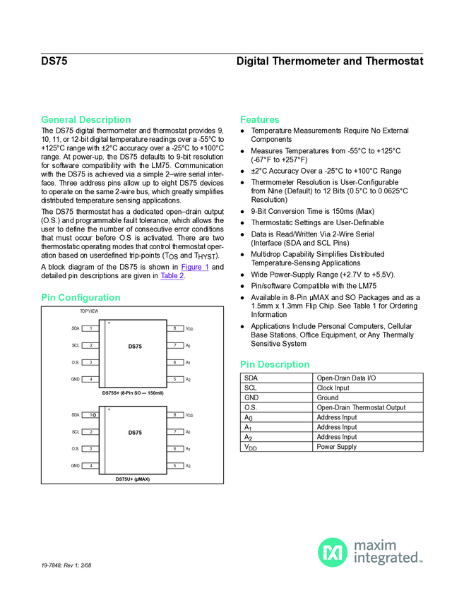 DS7505 High-Precision Digital Thermometer and Thermostat
