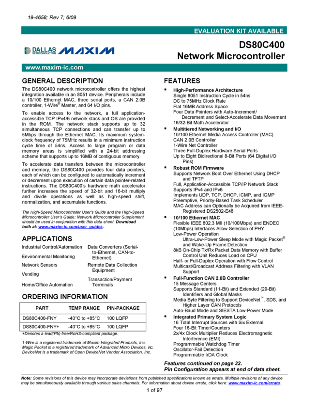 DS80C410, DS80C411 Network Microcontrollers with Ethernet and CAN