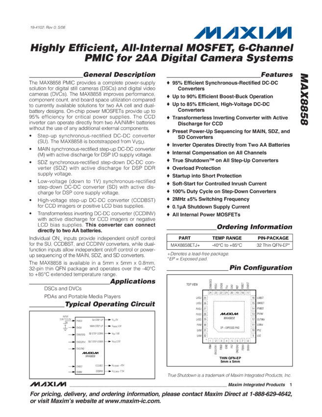 MAX8858 Smallest, All-Internal MOSFET, 6-Channel DSC PMIC in a 5mm x 5mm TQFN