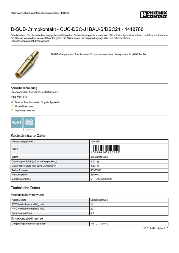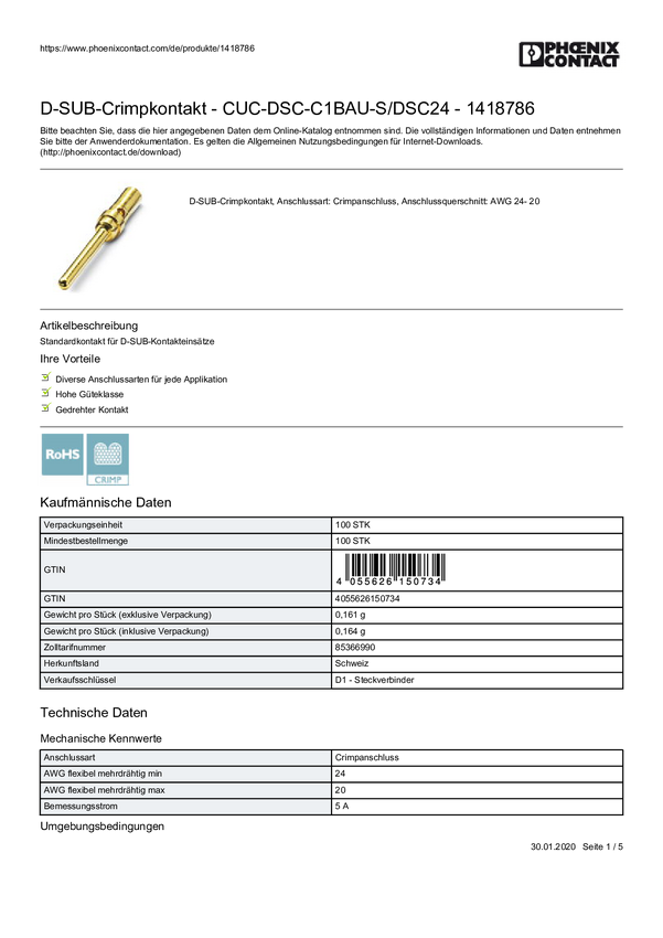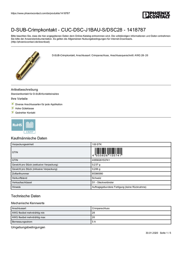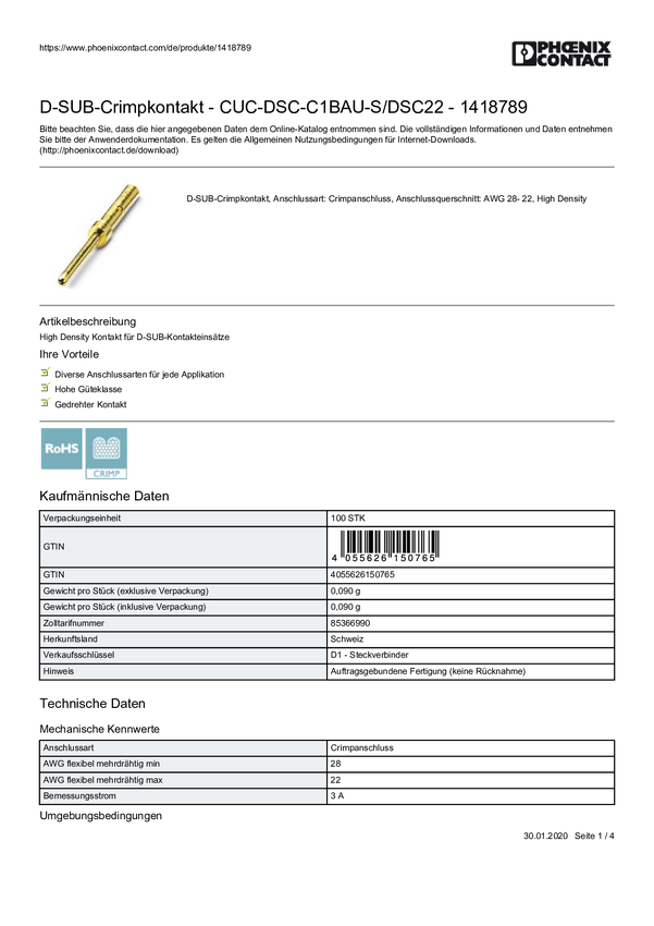 Phoenix Contact 1418787 CUC-DSC-J1BAU-S/DSC28 Styk zaciskowy Minimalna średnica przewodu (system AWG): 28 Maksymalna śre