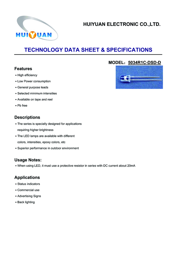 Dioda LED THT HuiYuan 5034R1C-DSD-D, czerwony, okrągły, 5 mm, 4000 mcd, 40 °, 20 mA, 2.1 V