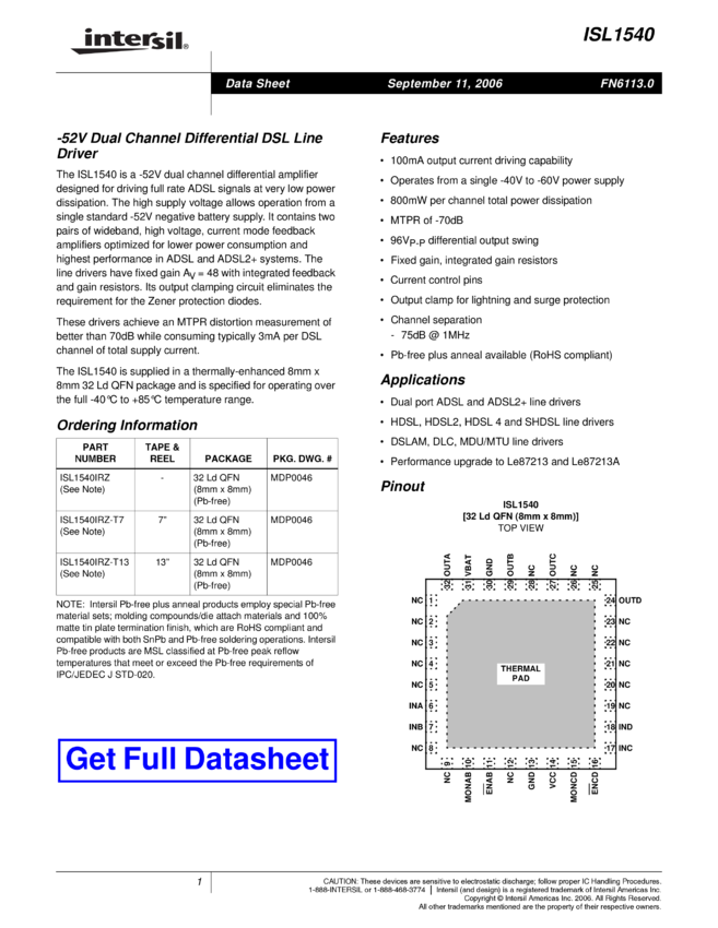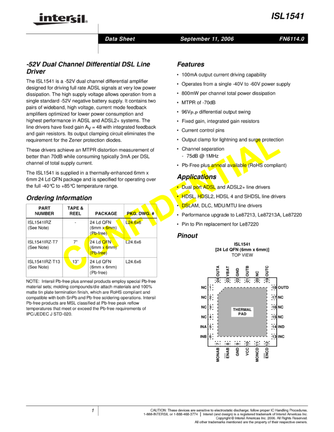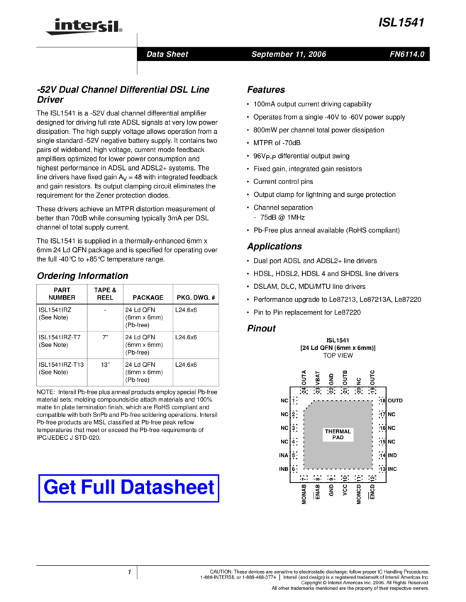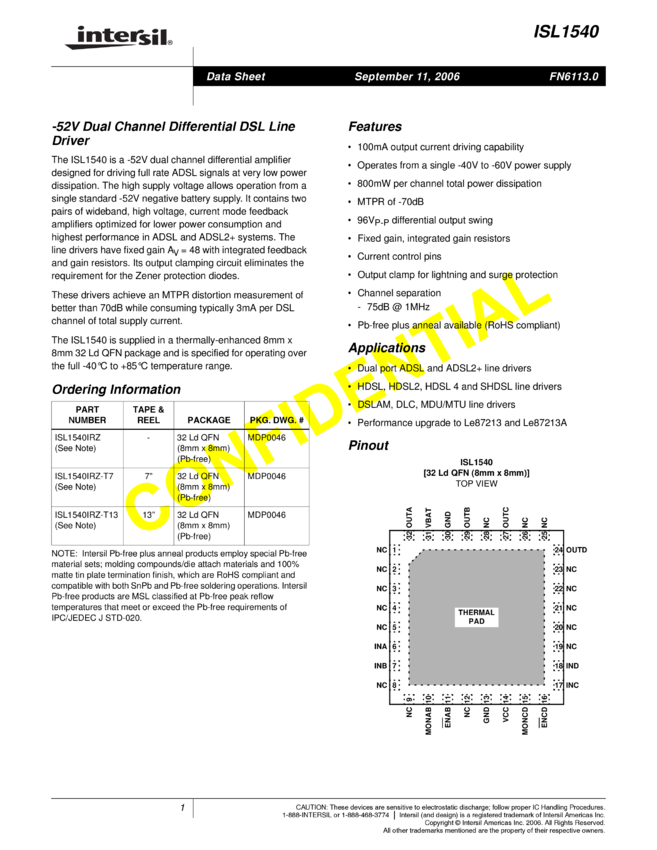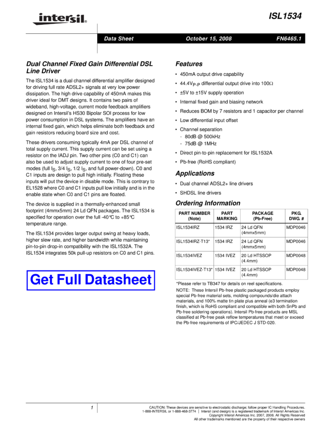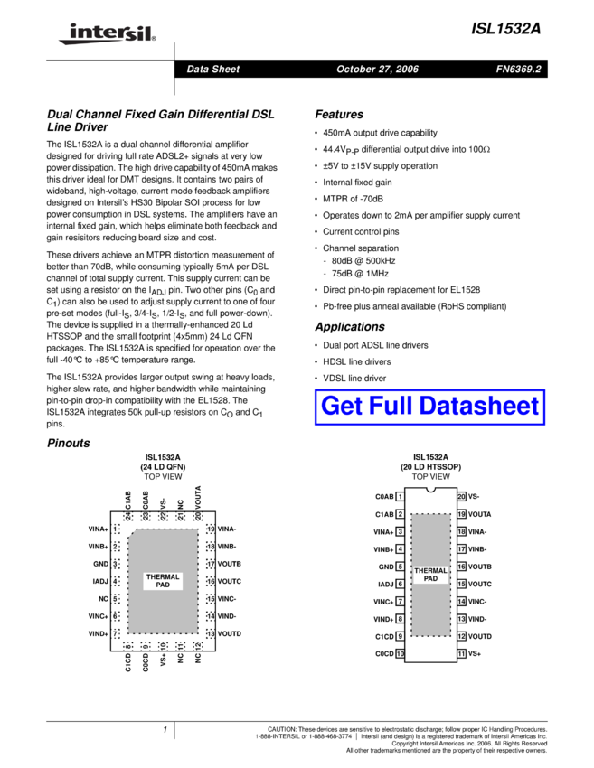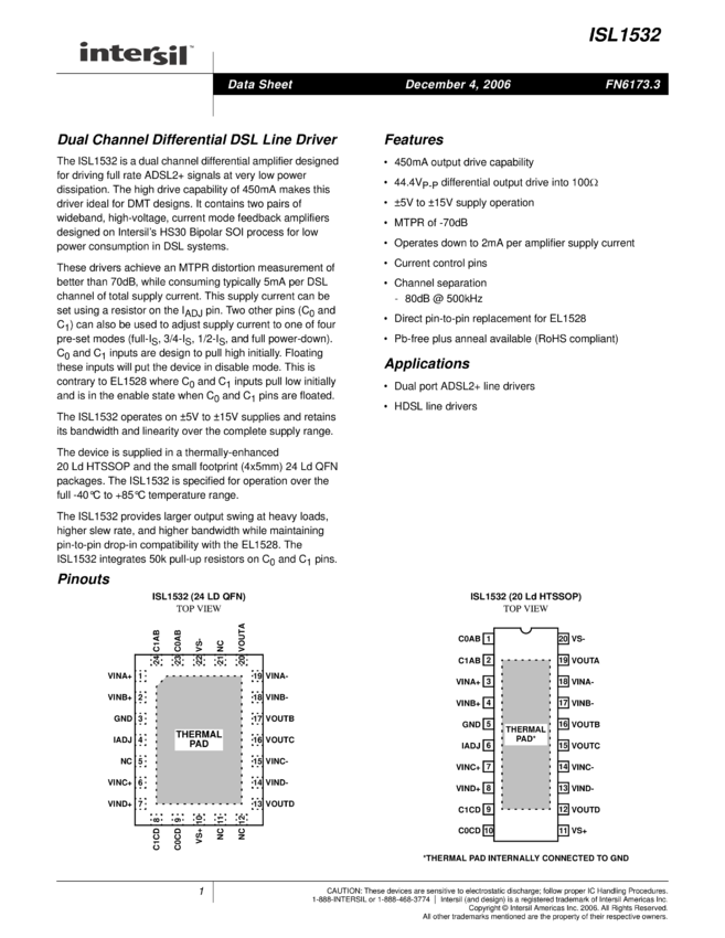 Dual Channel Fixed Gain Differential DSL Line Driver