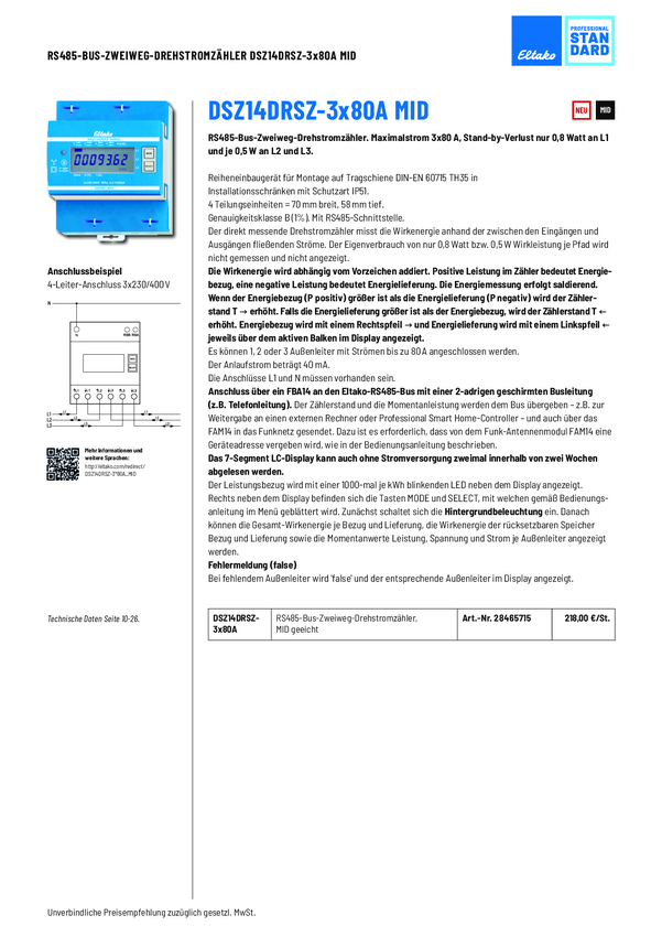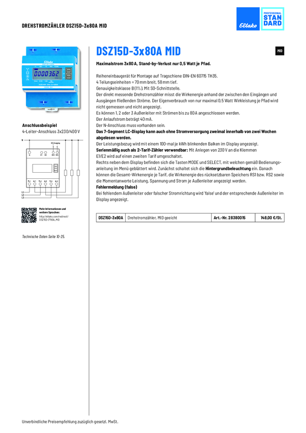 Eltako DSZ15DZ-3x80A MID 28480315 Licznik prądu trójfazowy cyfrowy 10 A 1 szt.
