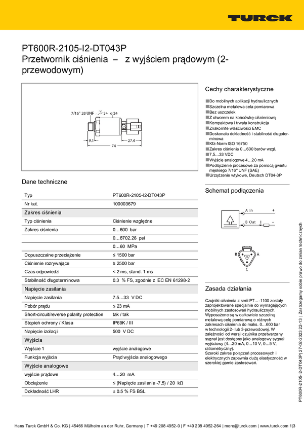 Turck Przetworniki ciśnienia 1 szt. PT600R-2103-I2-DT043P