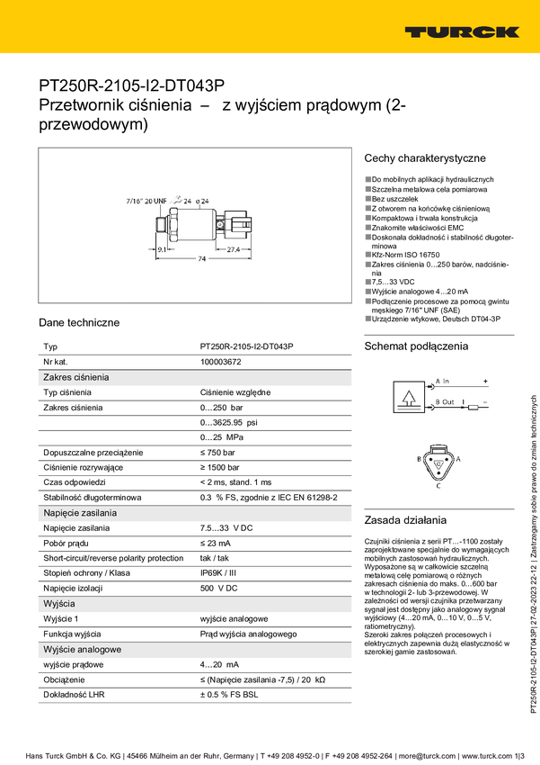 Turck Przetworniki ciśnienia 1 szt. PT250R-2105-I2-DT043P