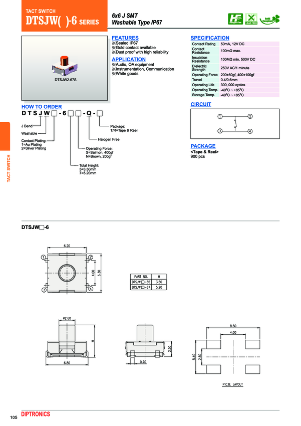 Switch Tactile N.O. SPST Flush Round Button J Bend 0.05A 12VDC 300000Cycle 1.96N SMD T/R