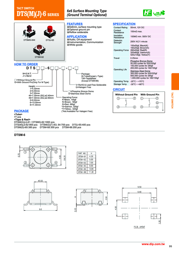 Diptronics DTSM-61S-V-T/R Przełącznik przyciskowy, 12 V/DC, 50 mA, 1 szt.
