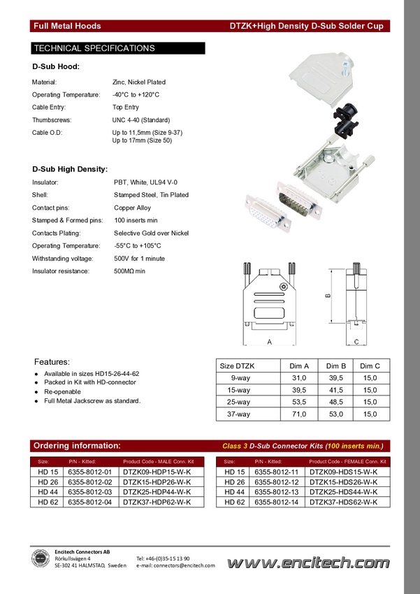 encitech DTZK09-BK-HDP15-K 6355-0102-01 Zestaw listew męskich D-Sub 180 ° Ilość styków: 15 kielich lutowniczy 1 szt.