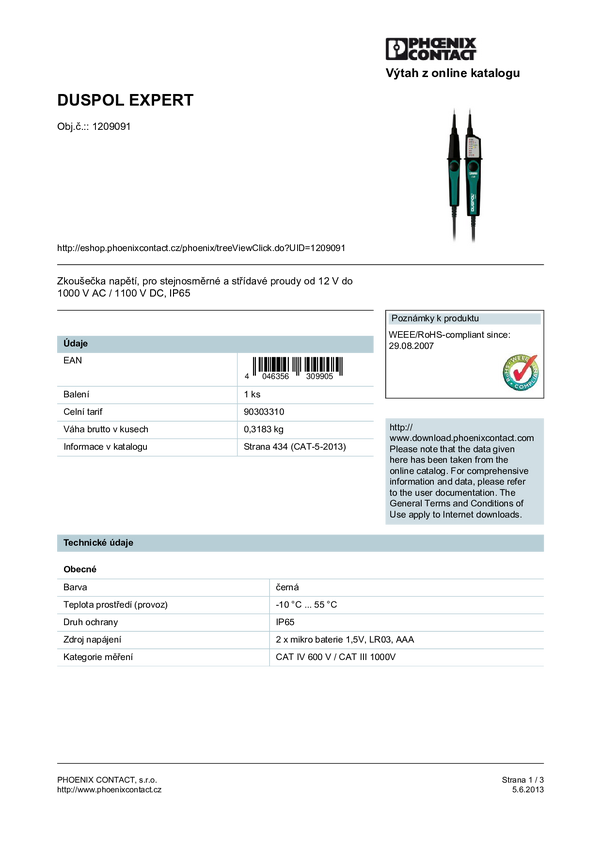 Dwubiegunowy tester napięcia Phoenix Contact DUSPOL EXPERT CAT III 1000 V, CAT IV 600 V Kalibracja (DAkkS)