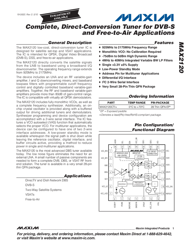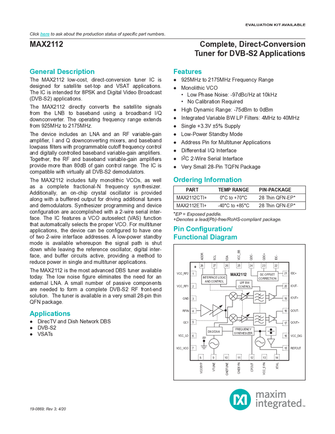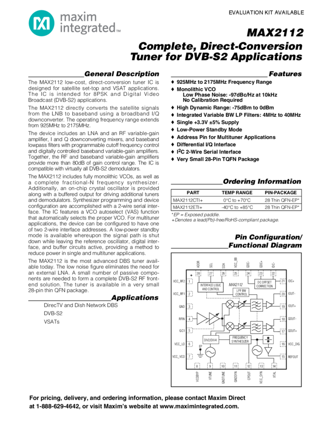 MAX2112 Direct Conversion Tuner for DVB-S2