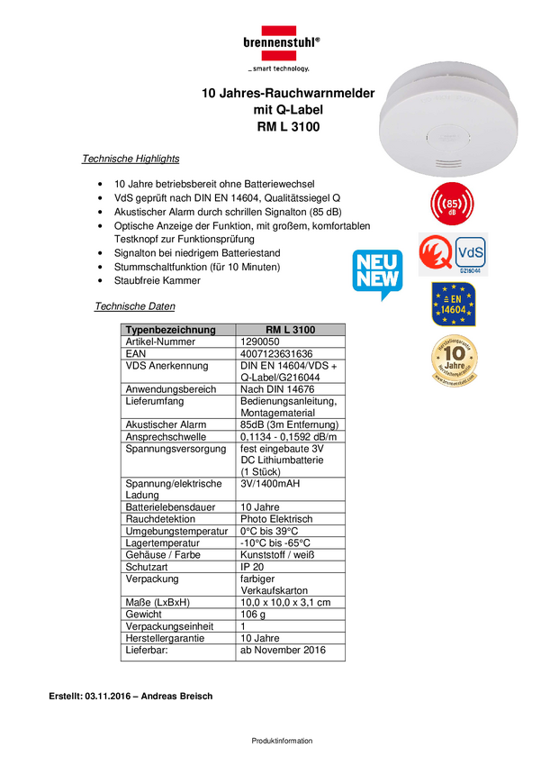 Brennenstuhl RM L 3100 Czujnik dymu bateryjne (Ø x W) 100 mm x 31 mm